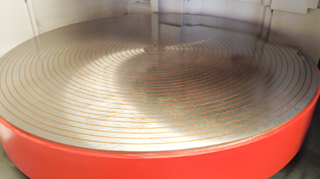 The machine is equipped with a round electromagnetic chuck that rotates the workpiece. The electromagnetic chuck is mounted on a sliding saddle, which moves reciprocally along the bed guideways, facilitating convenient loading and unloading of workpieces.